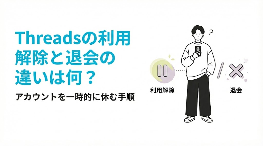 Threadsを一時的に休みたいなら「利用解除」、完全に辞めたいなら「削除」を選びましょう。どちらの操作を行っても、大切なInstagramのアカウントには悪影響が出ないよう設計されています。利用解除はログインするだけでいつでも再開できますが、削除は30日が経過すると二度とデータを取り戻せません。